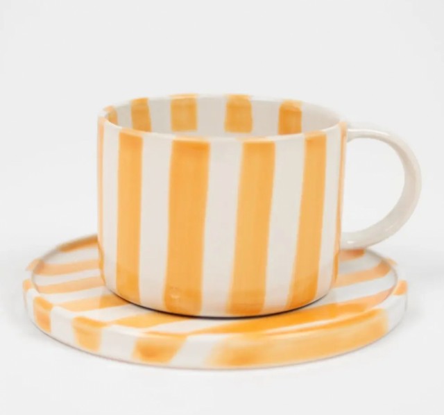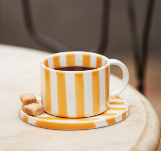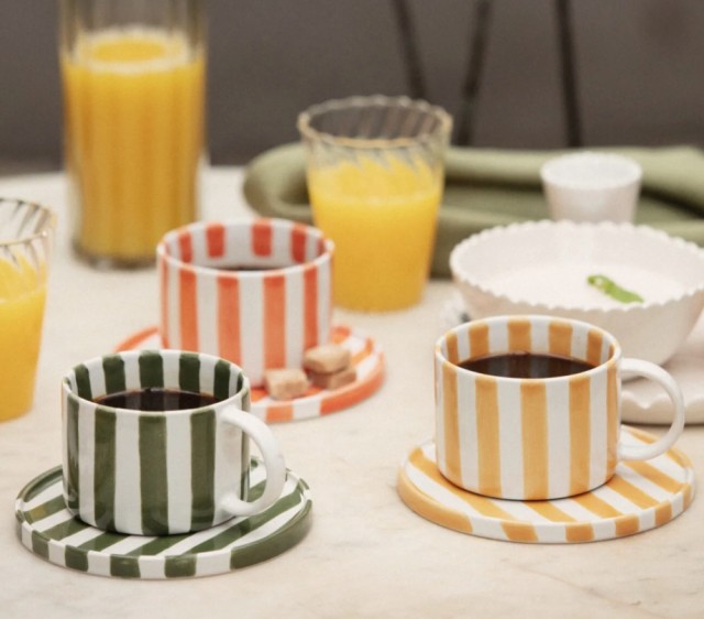 Vi forelsket oss helt de i stripete koppene med skpål i stengods fra Olsson och Jensen. Den lille tallerknen kan enten brukes som underskål til koppen eller som en liten kaketallerken ved siden av.