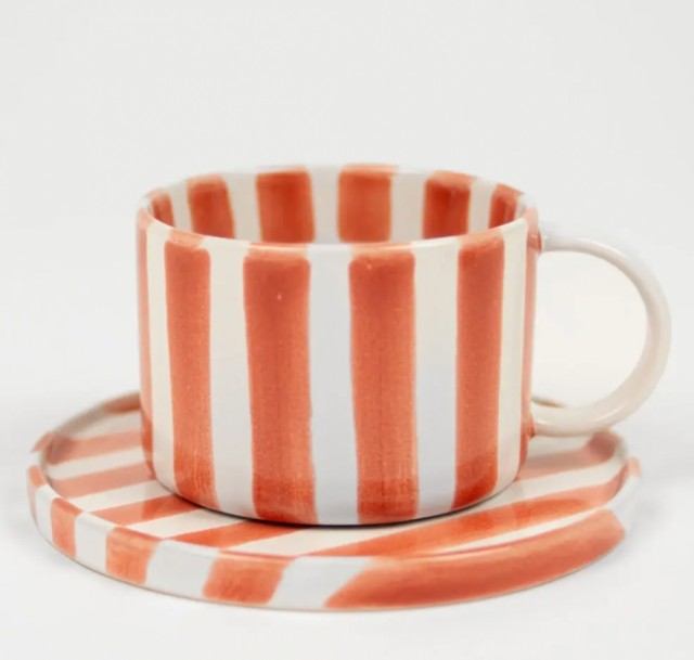 Vi forelsket oss helt de i stripete koppene med skpål i stengods fra Olsson och Jensen. Den lille tallerknen kan enten brukes som underskål til koppen eller som en liten kaketallerken ved siden av.