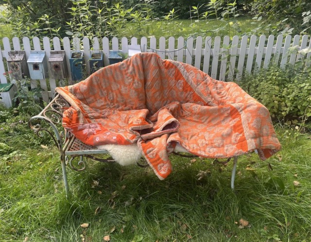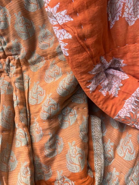 Alle teppene er sydd av brukte stoffer. Det betyr at de kan ha små reparasjoner, små eller store lapper i mer eller mindre lignende stoff, sømmer, flekker og være noe ujevnt slitt. De fleste stoffene er farget/trykket for hånd og flere har småfeil i trykkingen, litt lysere flekker og lignende. Alt dette elsker vi! Det gjør teppene personlige og stappfulle av små eventyr, historier, minner, drømmer, feiltrinn og liv. Vi elsker at stoffene kan brukes på nytt og at dere tidligre liv i India får bli med inn i mitt eller ditt liv her i Norge.