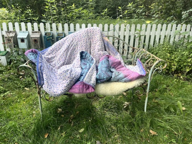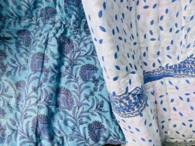 Alle teppene er sydd av brukte stoffer. Det betyr at de kan ha små reparasjoner, små eller store lapper i mer eller mindre lignende stoff, sømmer, flekker og være noe ujevnt slitt. De fleste stoffene er farget/trykket for hånd og flere har småfeil i trykkingen, litt lysere flekker og lignende. Alt dette elsker vi! Det gjør teppene personlige og stappfulle av små eventyr, historier, minner, drømmer, feiltrinn og liv. Vi elsker at stoffene kan brukes på nytt og at dere tidligre liv i India får bli med inn i mitt eller ditt liv her i Norge.