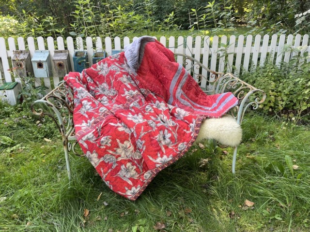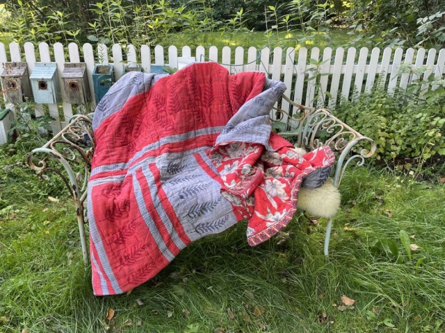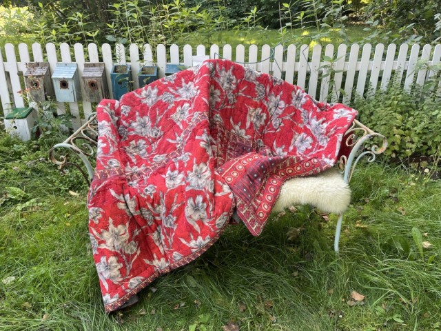 Alle teppene er sydd av brukte stoffer. Det betyr at de kan ha små reparasjoner, små eller store lapper i mer eller mindre lignende stoff, sømmer, flekker og være noe ujevnt slitt. De fleste stoffene er farget/trykket for hånd og flere har småfeil i trykkingen, litt lysere flekker og lignende. Alt dette elsker vi! Det gjør teppene personlige og stappfulle av små eventyr, historier, minner, drømmer, feiltrinn og liv. Vi elsker at stoffene kan brukes på nytt og at dere tidligre liv i India får bli med inn i mitt eller ditt liv her i Norge.