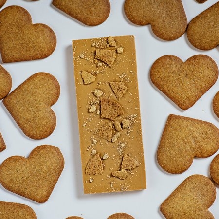 Kakaosmør*, uraffinert rørsukker*, ristet tørrmelk*, kanel*, ingefær*,nellik*, kardemomme* & pepperkake* (mel, sukker, lys sirup)